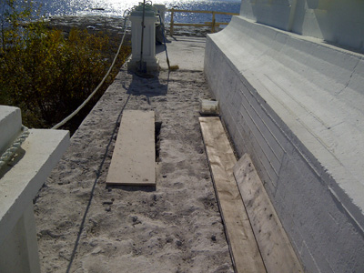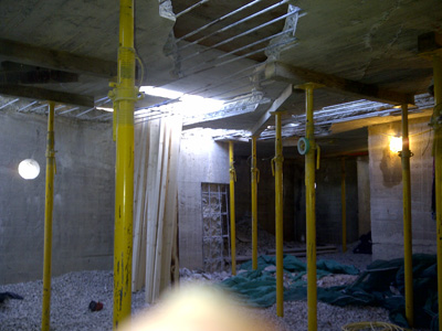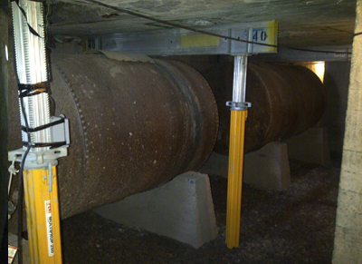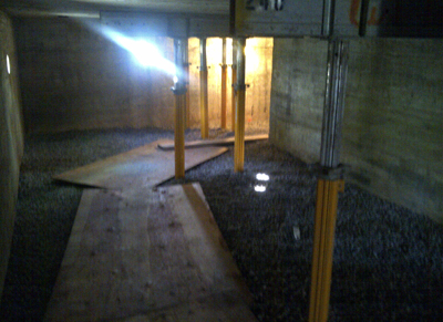 Basement of the lighthouse. All sediment has been removed and replaced with drainage tile and a layer of stone. Note the shoring required to support the pedestrian deck and scaffolding.
