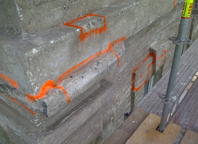Areas marked for repair. Note: the wall coverings (i.e. old paint,grime,etc.) have been removed over the majority of the tower now.