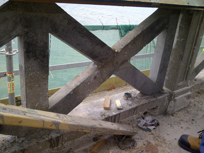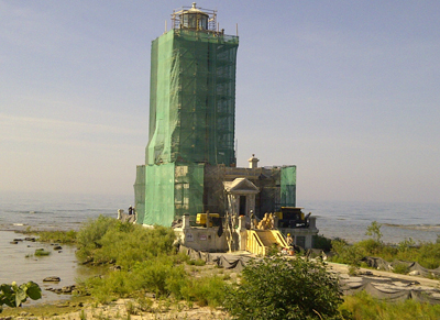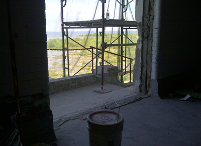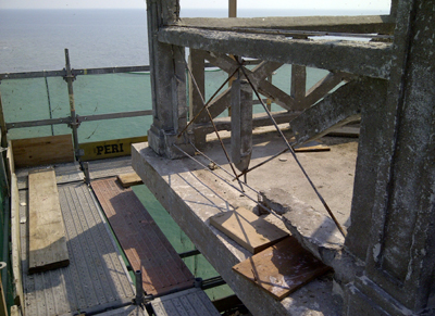 Note the extent of removal required on some portions of the decorative railing surrounding the lantern room of the tower. Only the rebar remains.