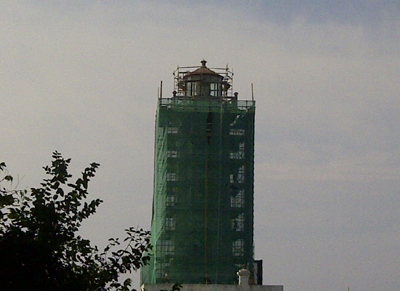 Scaffolding erected around the lantern room of the lighthouse.